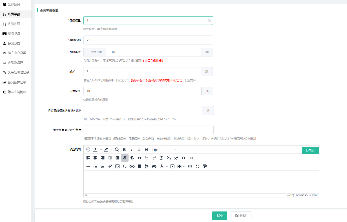 增加会员的奖励,设置不同的会员等级,享有不同的购物折扣以及用于权限设置。注意:会员等级默认订单完成后才能升级。
