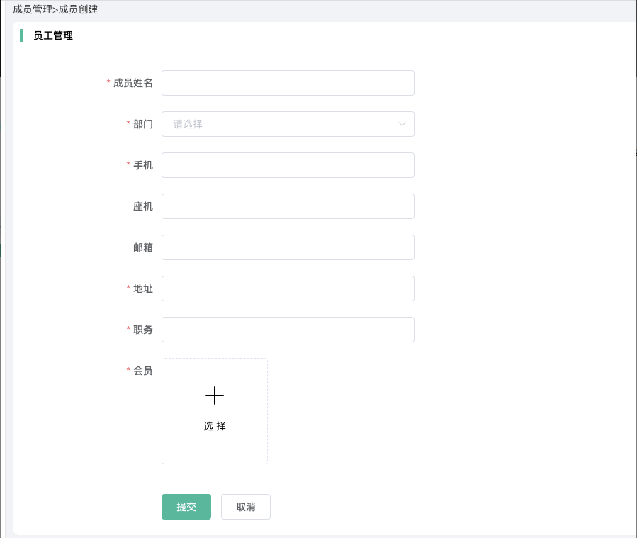 添加信息:姓名、部门、手机、地址、职务、选择会员