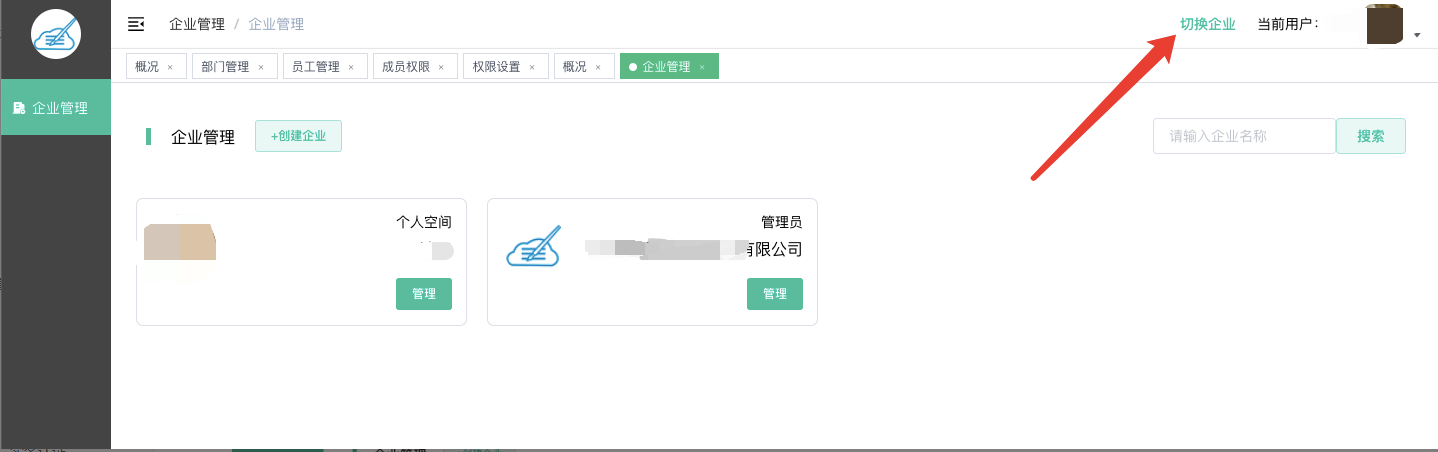设置员工为管理员:右上角切换企业