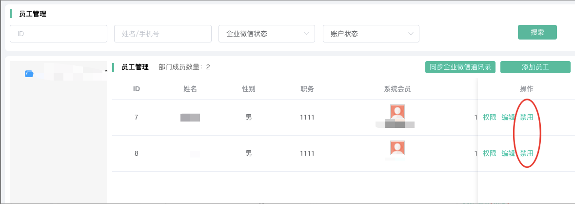 添加员工后没有删除员工的操作,如果员工离职,可以编辑员工,更换员工信息即可